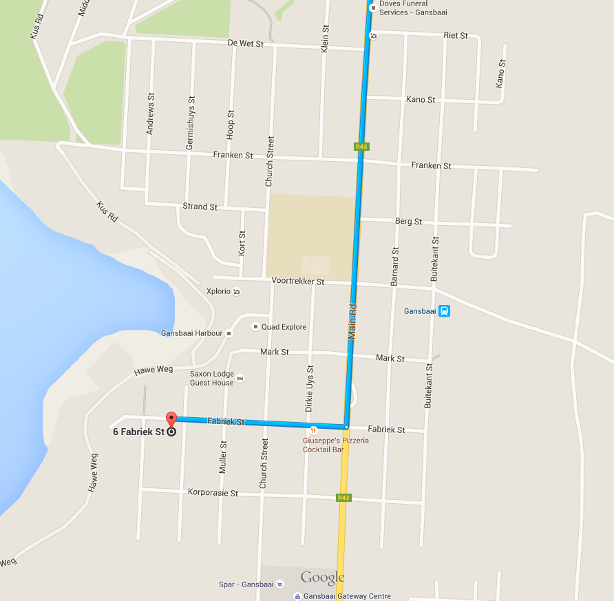 When arriving in Gansbaai, follow the main road to the 4 way stop where the Absa Bank is on your left.